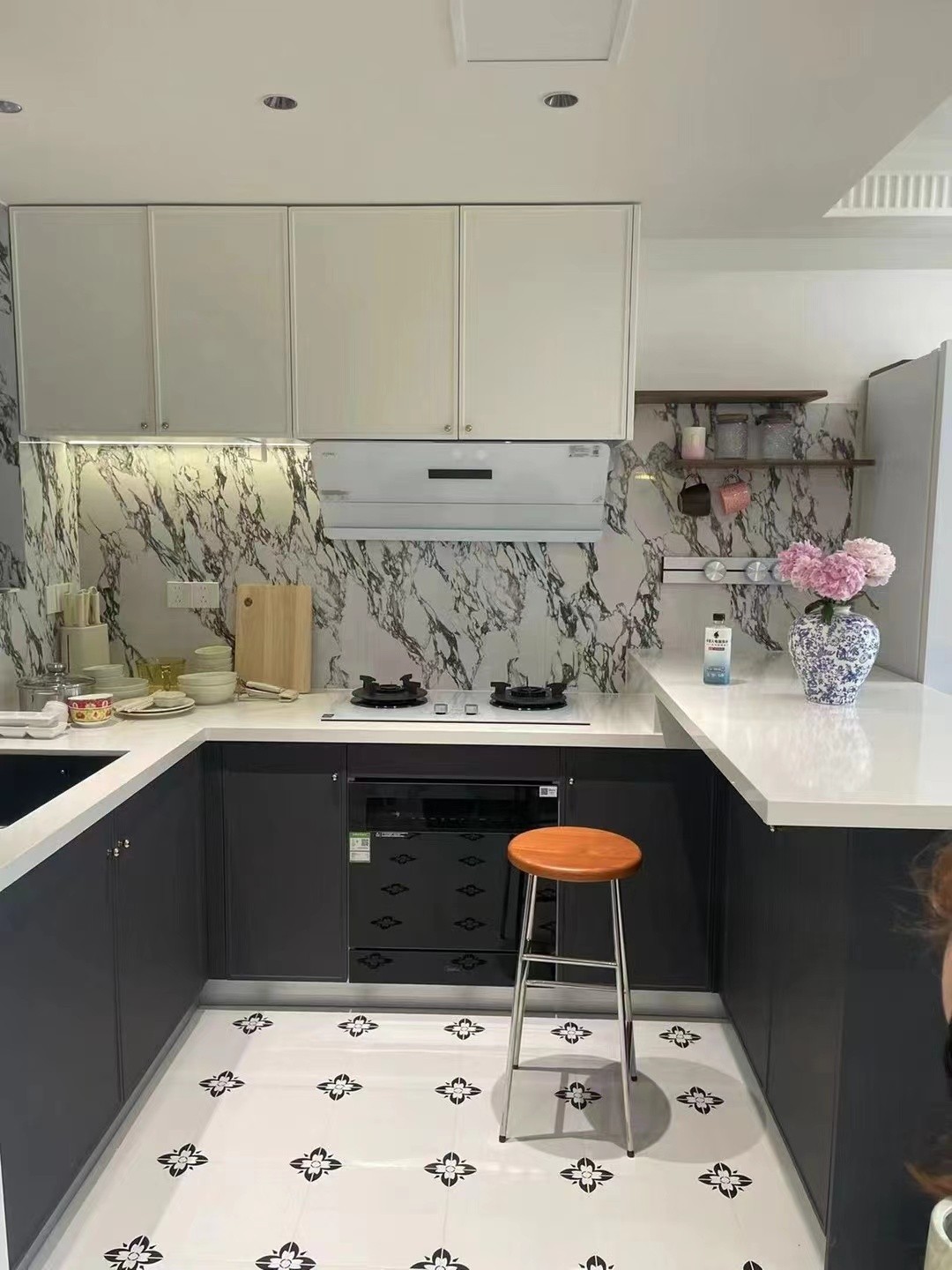 厨房的墙砖采用的纹路感很多的黑白砖,立体空间感十足