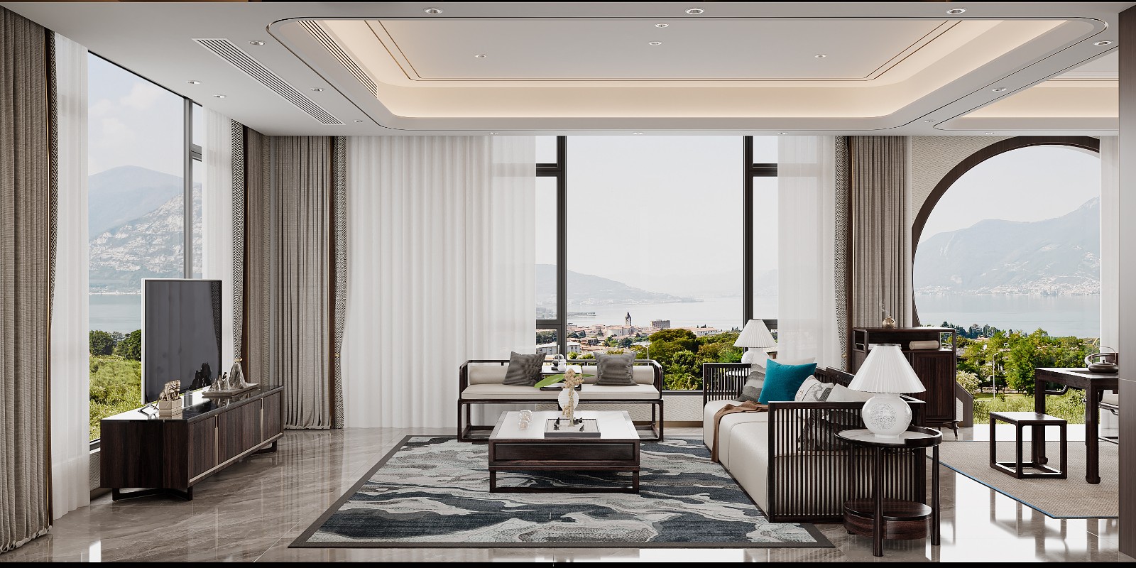 这是新中式风格客厅,空间宽敞明亮,以大窗户引入山水景色。吊顶造型精致,搭配简洁灯具。家具选深色实木与浅色软包,茶几、电视柜等营造典雅氛围,地毯、抱枕增添细节,整体呈现出传统韵味与现代舒适融合的格调