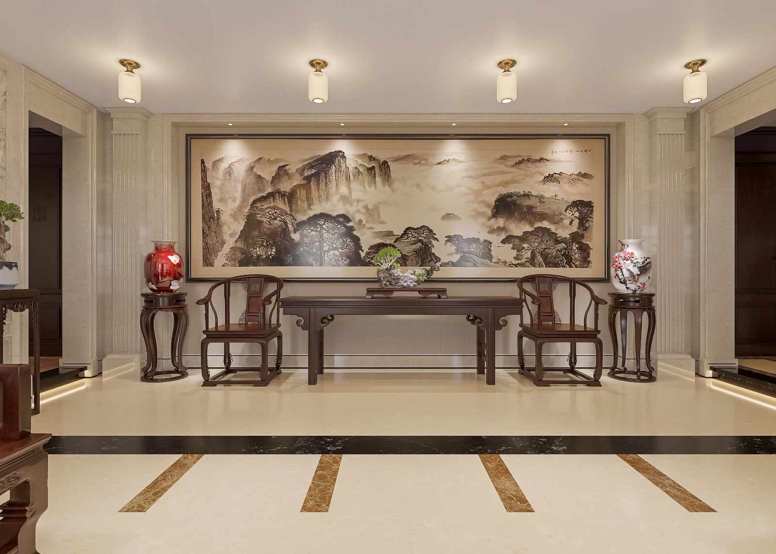 家具选雕花椅、案几,搭配字画、盆景、瓷器,营造典雅氛围;