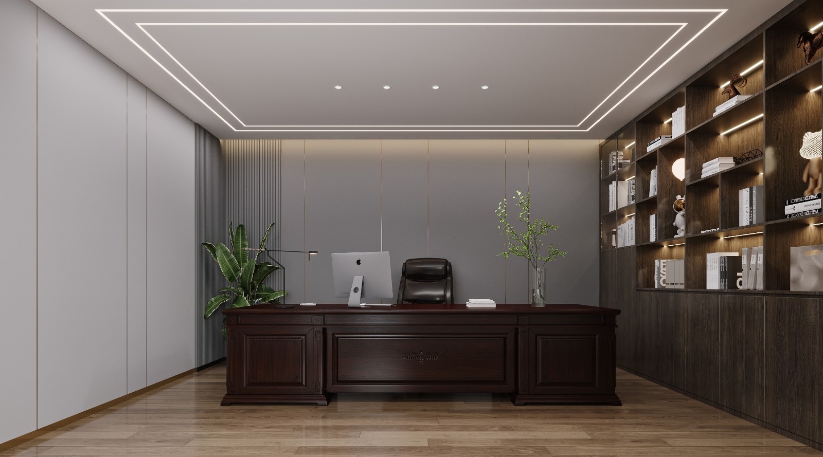 这是现代中式风格的董事长办公室。深色实木大班台搭配皮质座椅,沉稳大气。天花板有线条灯带,营造简洁明亮氛围。一侧墙是带灯效的木质书架,陈列书籍与装饰,增添文化气息。绿植点缀生机,整体空间兼具办公实用性与格调 。