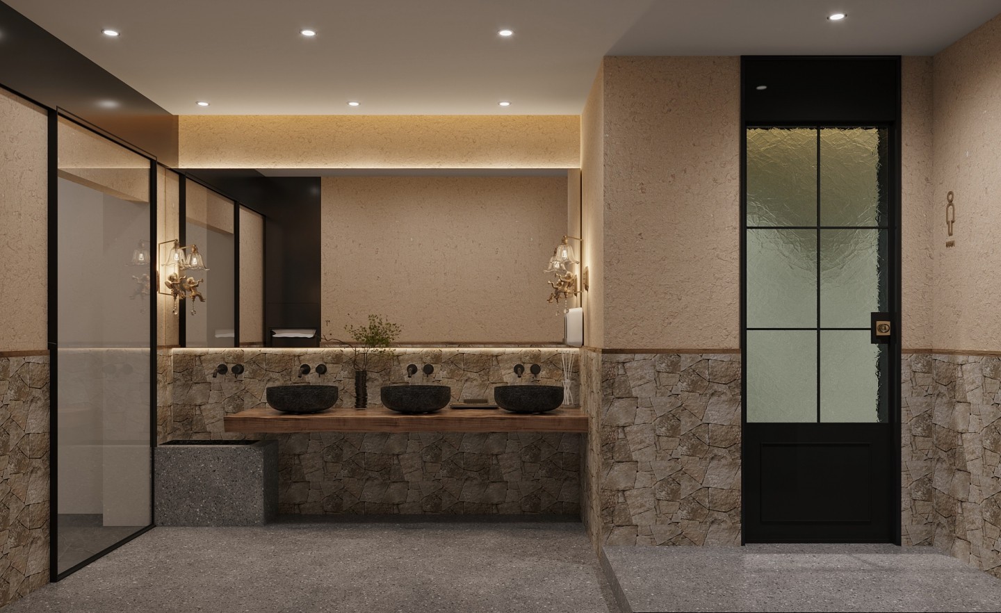 以石材墙面、地面为主,搭配黑色洗手盆、木质台面,黄铜灯具增添精致感,玻璃隔断划分空间,整体营造出质朴又有格调的氛围 。