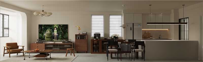 客厅餐厅厨房全部打开,整体比较通透,餐厅加吧台的形式让视线更宽阔
