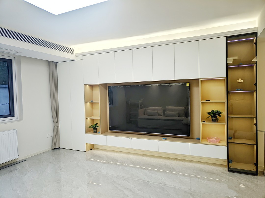 客厅开间还是很大的,很宽敞,电视柜做的是整墙设计,