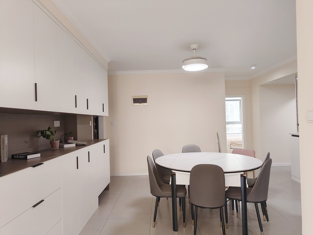 餐厅很大,放了一个大圆桌,完全不影响正常的走路活动,而且桌子也可以收纳起来,平时一家五口人就餐,收起来节省空间,就餐也不拥挤。餐厅上面的灯是风扇灯,可以当作小风扇使用,可以说非常凉爽