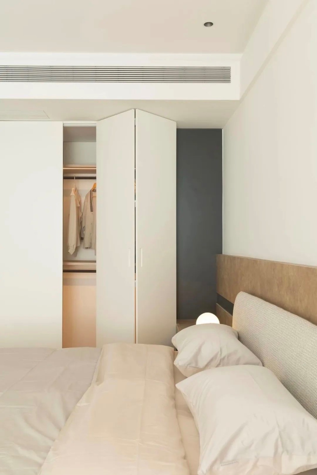 卧室天花以流动的弧线消解建筑棱角,柔和的间接光源营造出疗愈氛围。蓬松的床品如同云朵包裹身躯,搭配功能性的休闲椅与边几,在开阔布局中实现实用与美学的双重优雅——这里没有尖锐的转折,只有对身心柔软的***呵护。