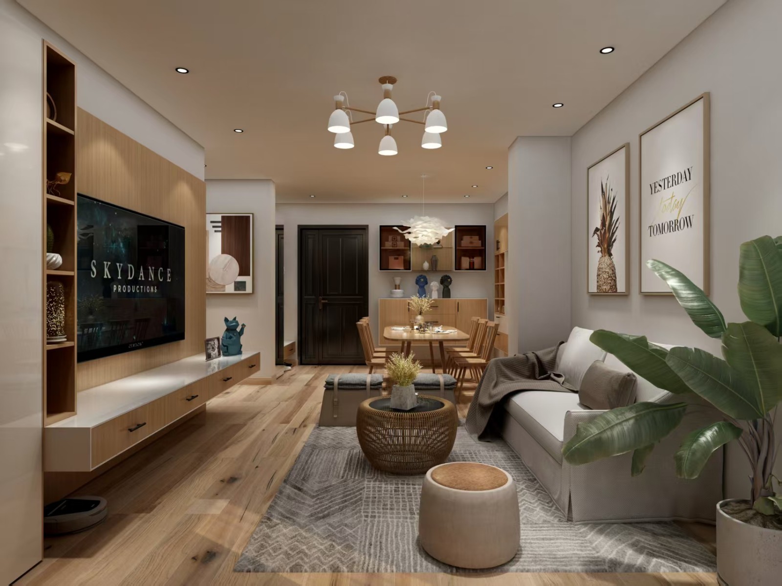 以浅木色、米色为主色调,温馨自然。客厅电视墙是木质收纳柜,嵌入电视,摆着小摆件;沙发浅灰,搭配抱枕、毛毯,旁有绿植点缀。餐厅与客厅相连,木质餐桌椅,上方吊灯别致,餐边柜陈列装饰。空间开阔,布局合理,灯光柔和,营造出舒适惬意的居住氛围 。