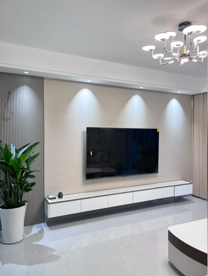 全屋通铺,电视及沙发背景做背景墙;双眼皮天花不藏灰;