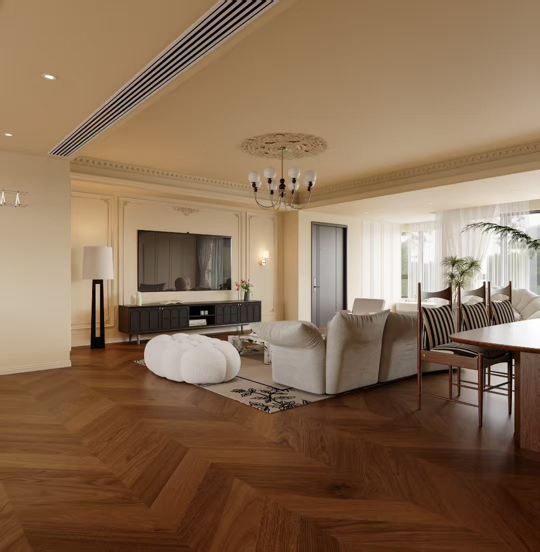 这个客厅呈现出典雅的法式风格。墙面装饰有精致雕花线条,搭配华丽的吊灯,尽显高贵气质。电视墙简约大方,深色电视柜沉稳厚重。浅米色的沙发柔软舒适,一旁的白色云朵形坐墩增添了几分俏皮。地面铺设鱼骨拼木地板,质感十足。 窗边绿植点缀,窗帘轻柔飘逸,整体营造出温馨、舒适且富有格调的居住氛围,是休闲与待客的理想空间。