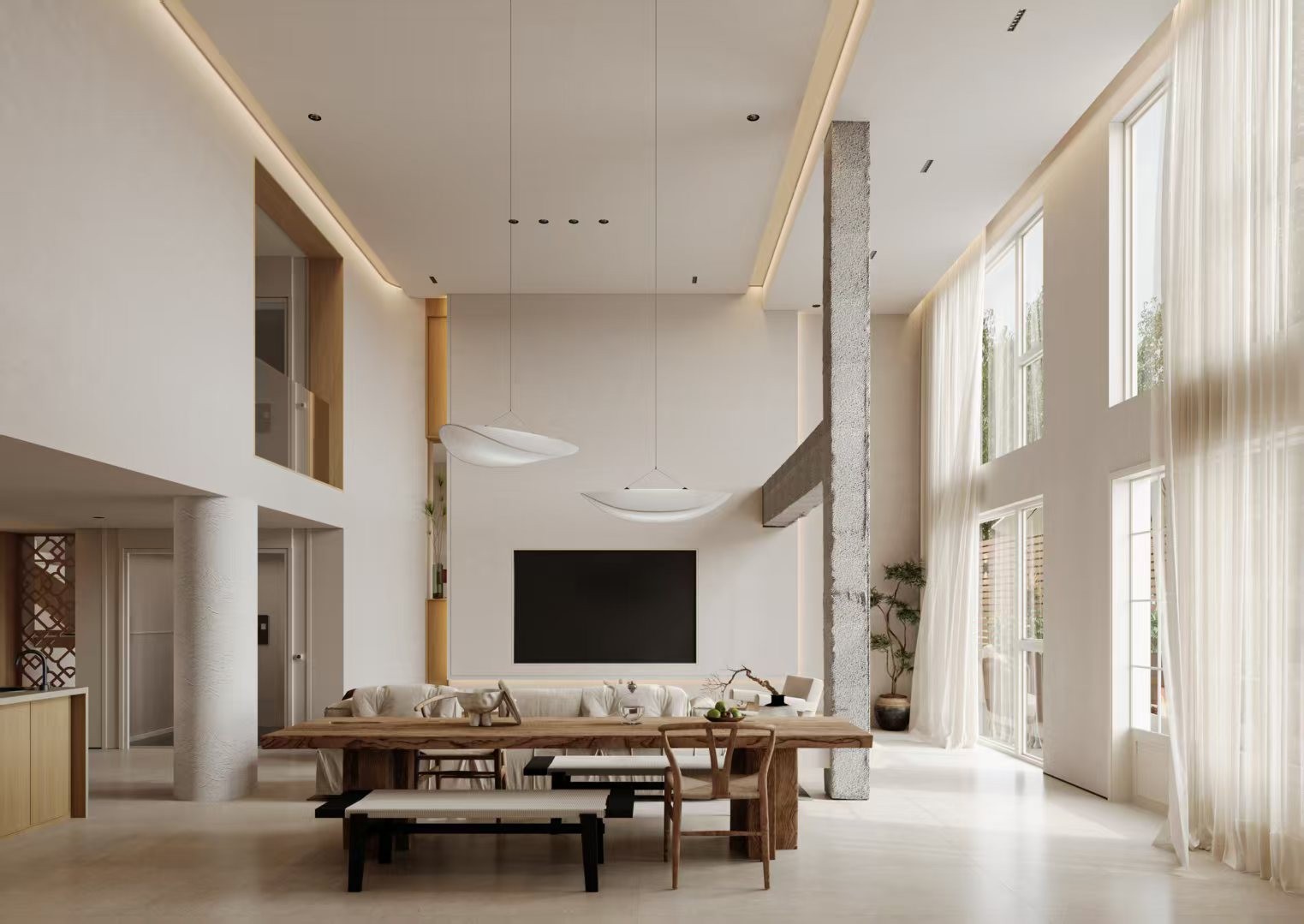 这是侘寂风挑空客厅,空间通透明亮。浅米色墙面搭配质朴水泥柱,营造自然氛围。悬浮式长餐桌兼具用餐与社交功能,上方双曲面吊灯简约别致。巨幅电视墙与低矮沙发呼应,大窗配轻柔纱帘,引入充足光线,将户外绿意融入室内,整体开阔舒适,尽显极简美学与空间张力 。