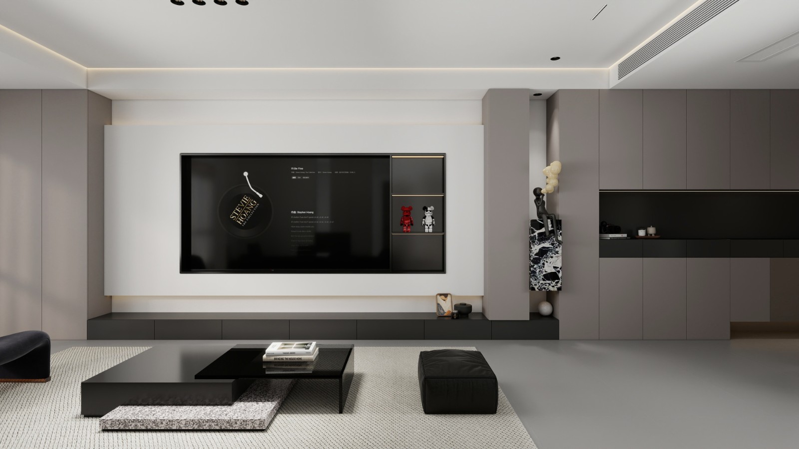 以灰白为主色调,搭配悬浮电视墙。嵌入展示架陈列潮玩,线条利落,灯光简约,营造时尚、精致且具个性的休闲空间。