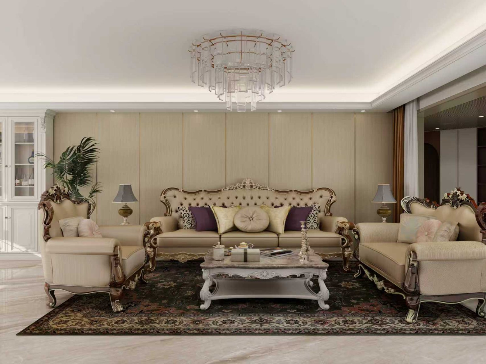 以米色为主调,搭配雕花家具、水晶吊灯。沙发抱枕色彩丰富,地毯、绿植点缀,营造优雅精致、富有格调的休闲空间。
