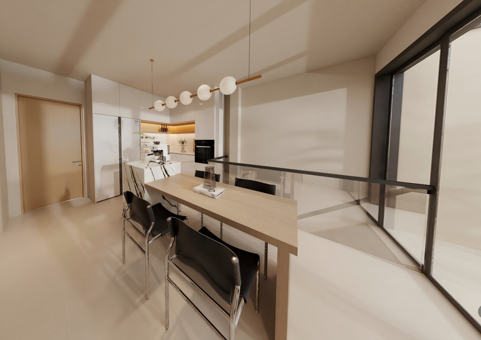 复式设计,整体采用大面积柔光砖通铺。墙顶地一体色