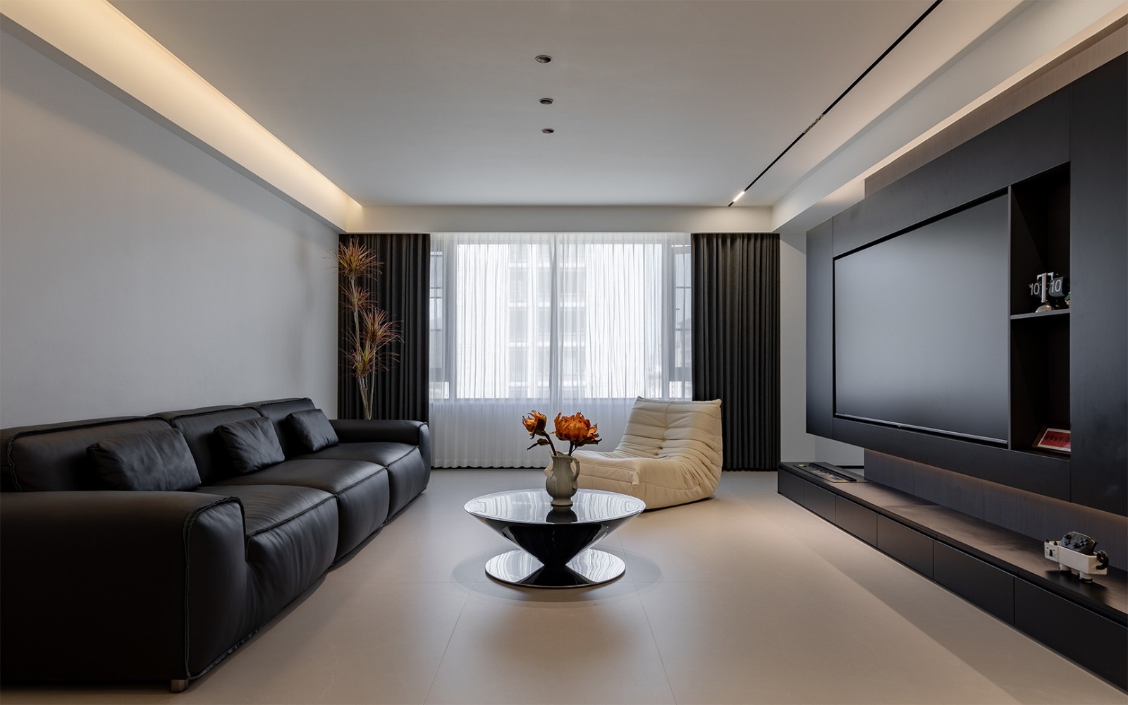 哑光皮质沙发如一方静默的岛屿,沉稳地锚定空间;背景墙覆以整面黑色岩板,肌理隐现,与悬浮的电视柜构成轻重平衡。