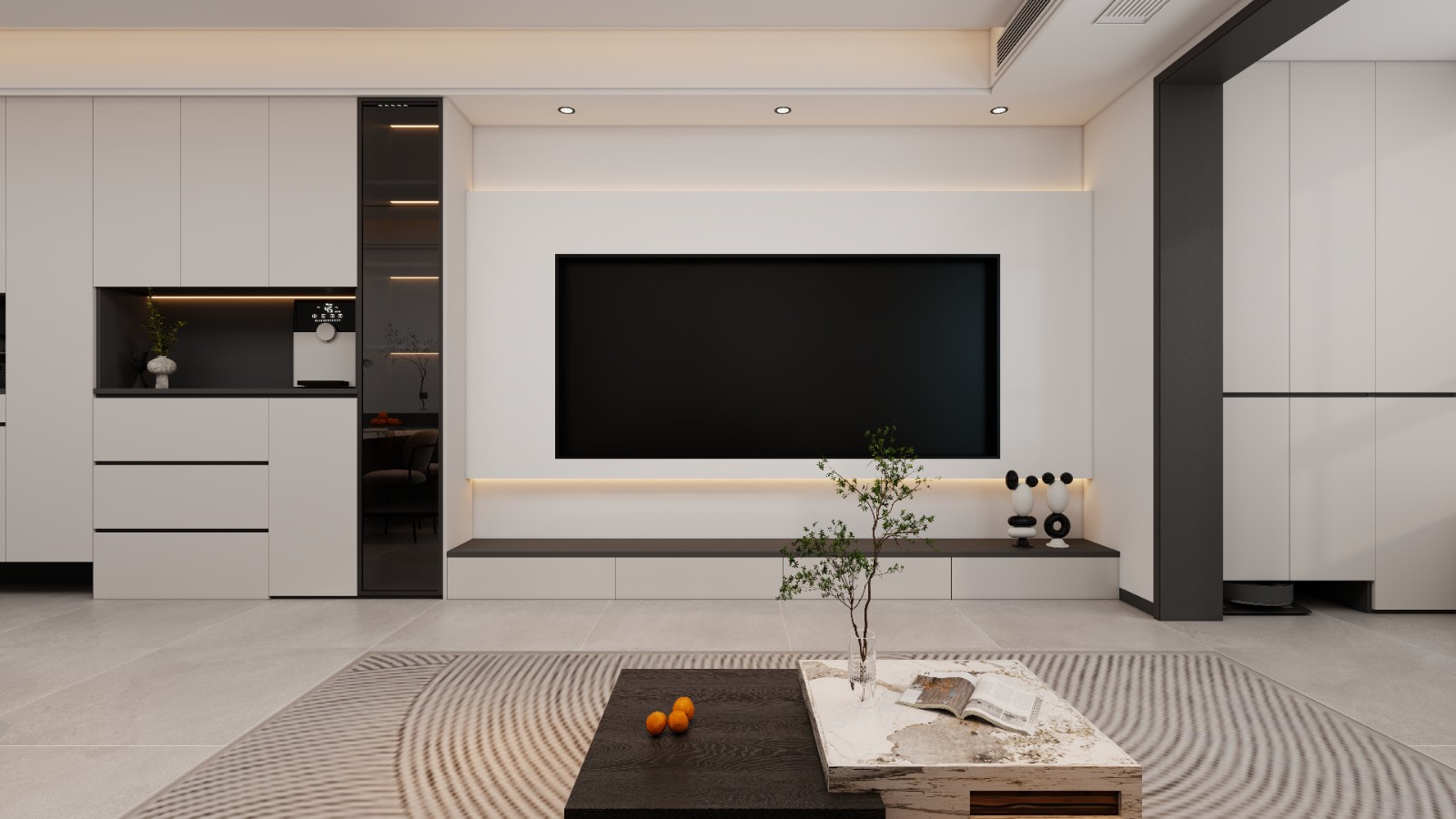 一体化柜体增强收纳,无主灯设计搭配线性光,浅色调与自然绿植融合,营造简洁大气、舒适温馨的公共空间 。
