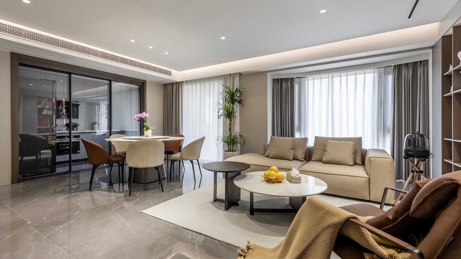 客餐厅一体化设计,***化高效有机利用整个空间。 考虑到空间的线条对称,将沙发和餐桌放在同一水平线上。