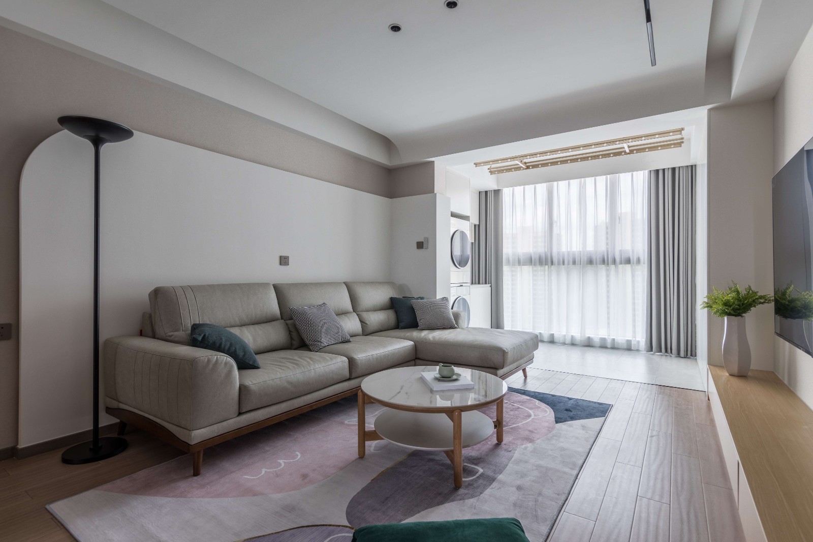 客厅中间布置圆形双层小茶几,再铺上几何拼接的地毯,在自然光下,呈现出一种明亮舒适的温馨。