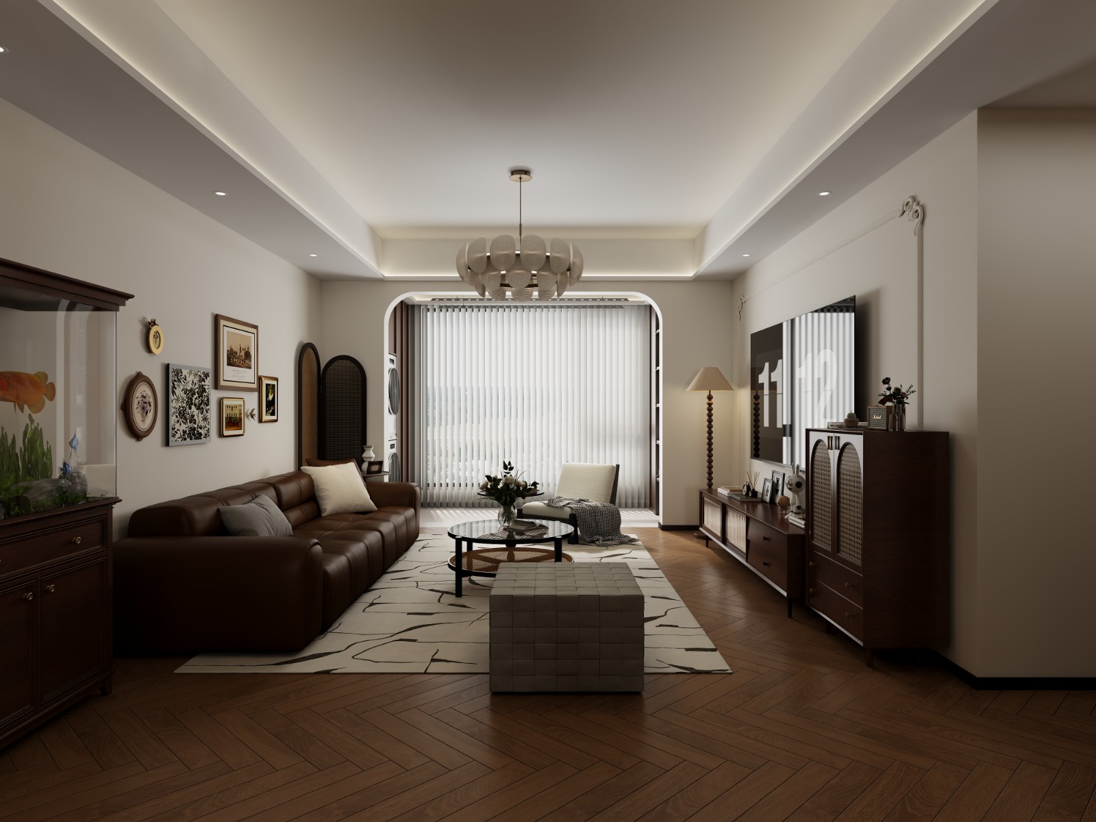 棕色皮沙发、艺术挂画搭配木质家具,弧形门洞引入光线,营造温馨有格调的起居氛围