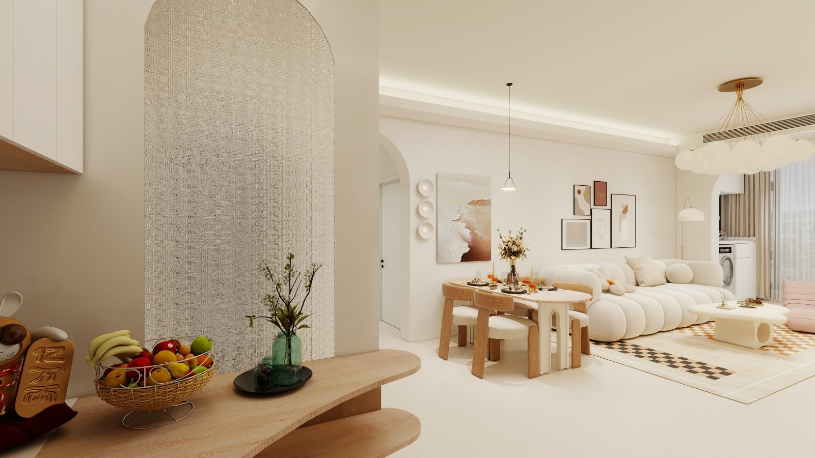 奶油风,弧形元素、浅木色家具,搭配艺术装饰与水果点缀,营造温馨治愈的公共起居氛围 。