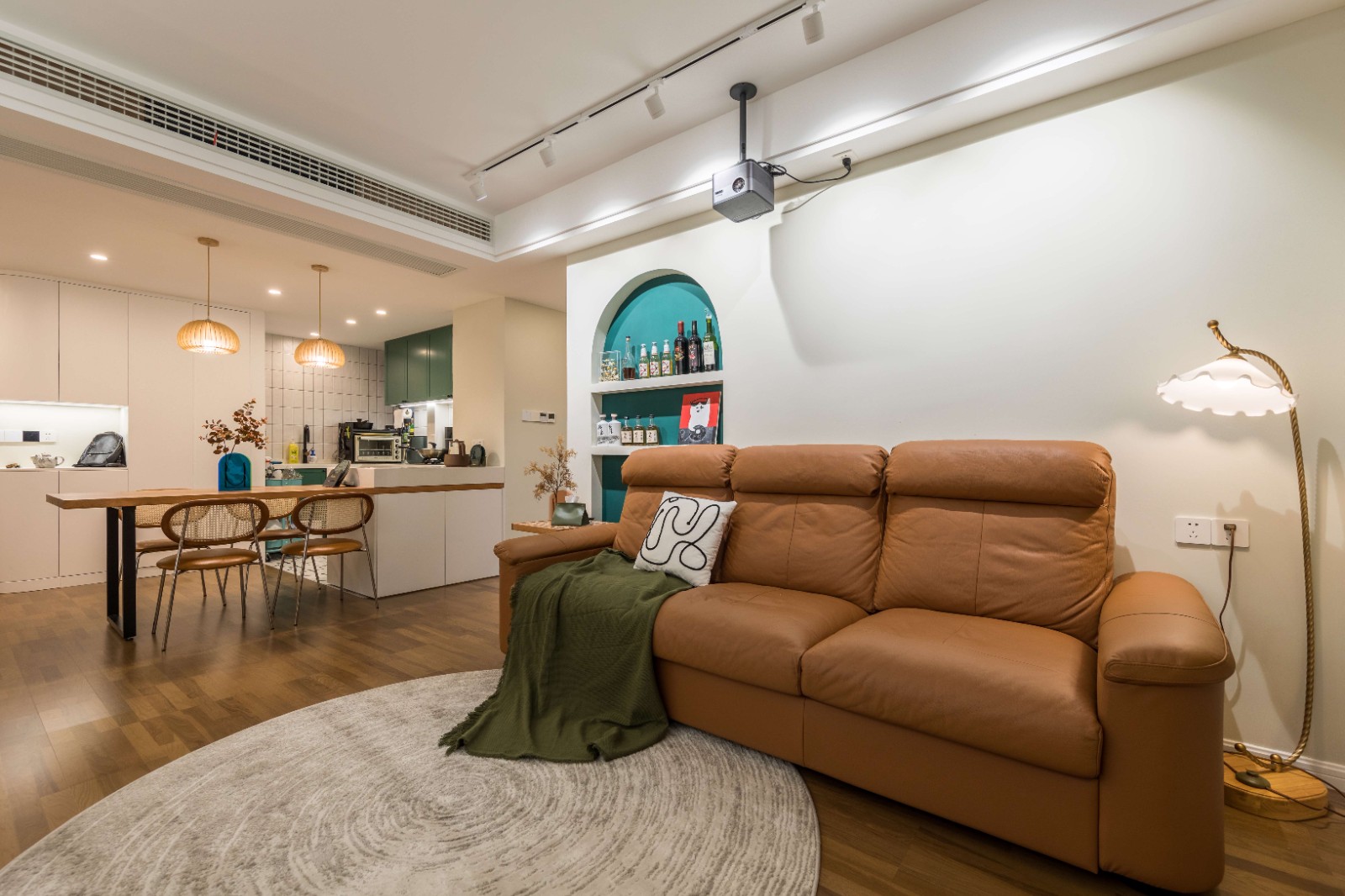 客厅位于进门最前方,整体采用米白色的墙顶面,为避免单调,底部温润的木质地板增添了一份文艺气息。