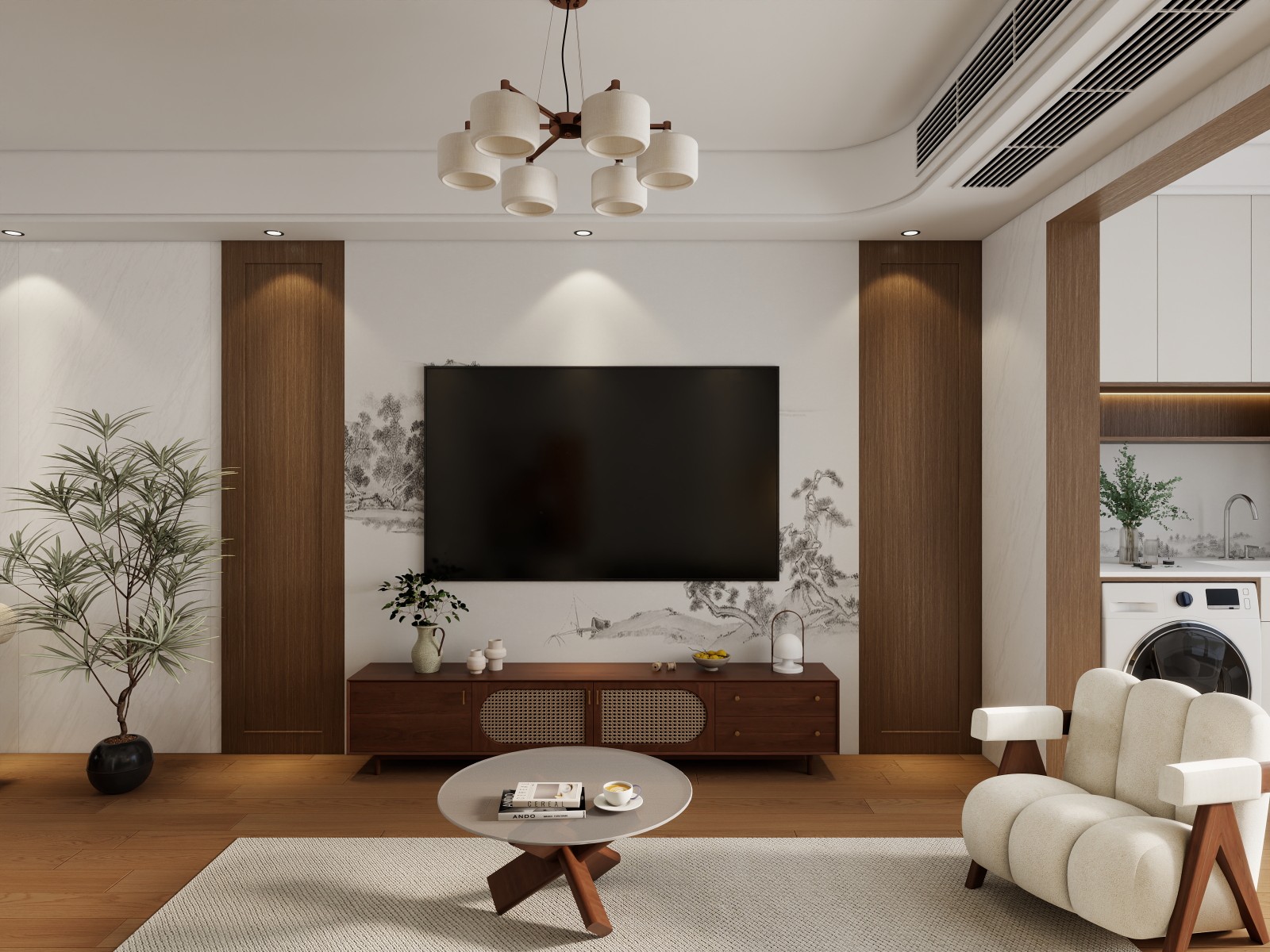 木质家具、山水背景墙,搭配绿植,营造典雅温馨的起居氛围 。