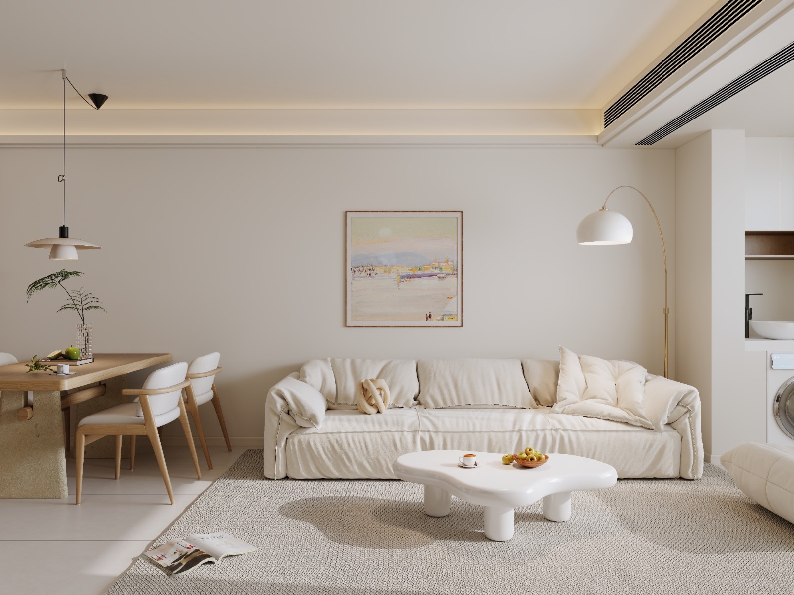 奶油风,浅色调,简约家具、艺术挂画,搭配绿植,营造温馨舒适的起居氛围 。