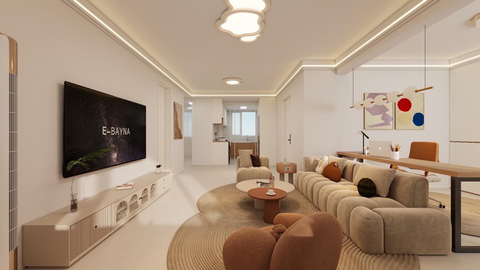 以浅色调为主,融合洄游动线设计,电视墙简约,沙发区与办公区联动,灯光层次丰富,营造开阔且具功能兼容性的起居空间。
