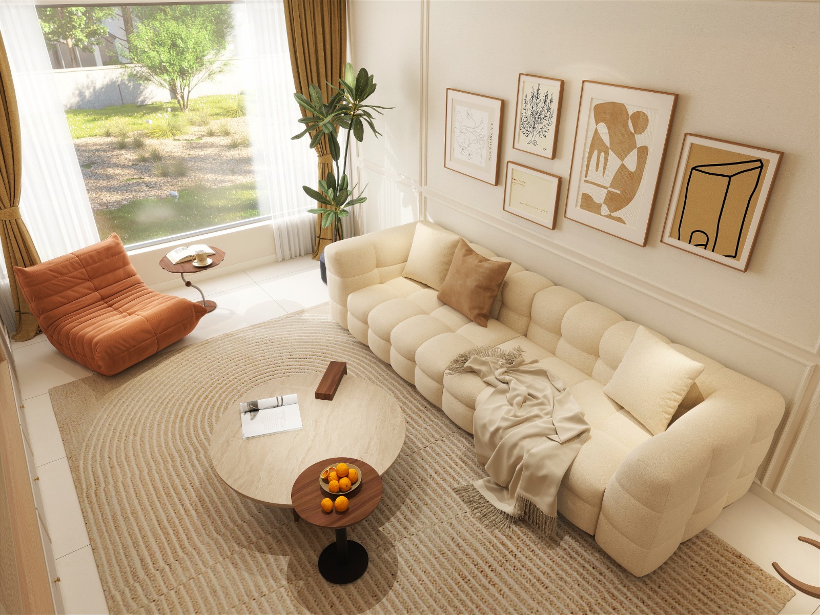采用奶油风设计,圆润家具造型、柔和色调营造温馨氛围,大幅落地窗引入自然光线,艺术挂画与绿植点缀,构建松弛惬意的社交起居空间 。