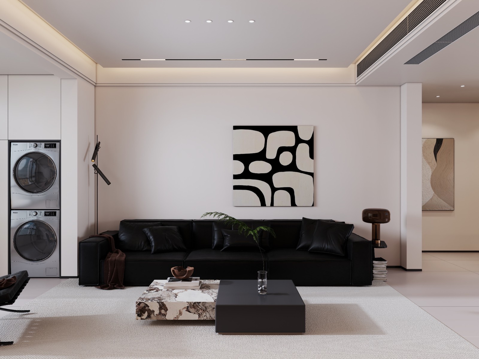 简约黑白为主色调,嵌入式洗烘机节省空间,搭配艺术挂画、极简家具,线性灯光勾勒层次,营造简洁大气的现代居住氛围。