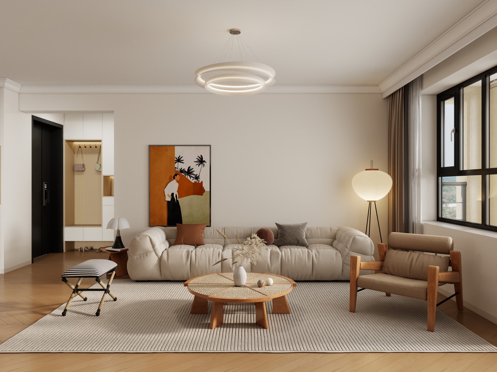 采用侘寂风设计,以浅色调营造温馨氛围。弧形沙发、藤编茶几搭配艺术挂画,灯光柔和,入户收纳与休闲区融合,体现自然简约的居住美学 。