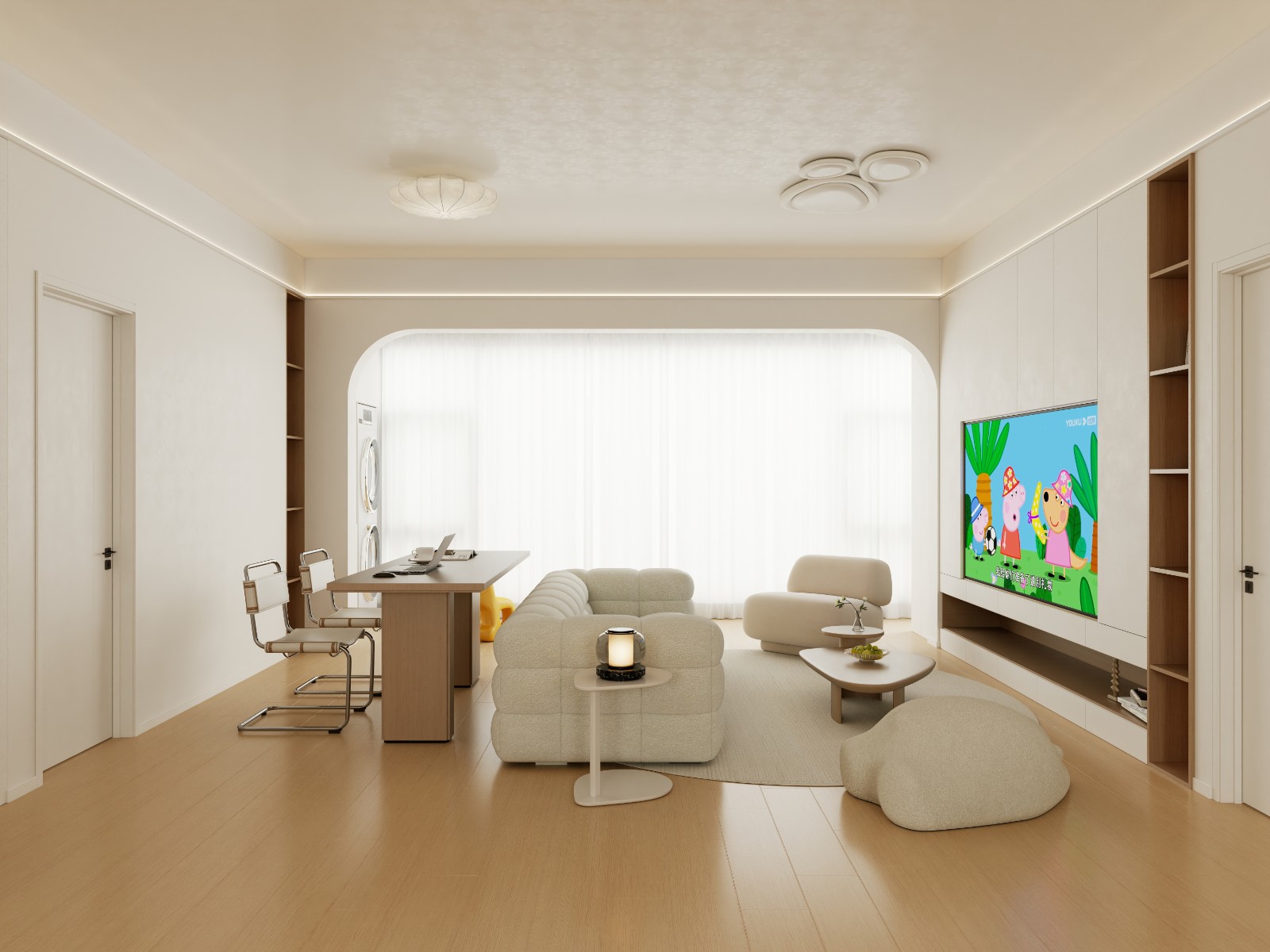 奶油风基调,弧形元素柔化空间,功能分区清晰,沙发、休闲椅营造松弛感,电视墙与收纳结合,兼具美观与实用。