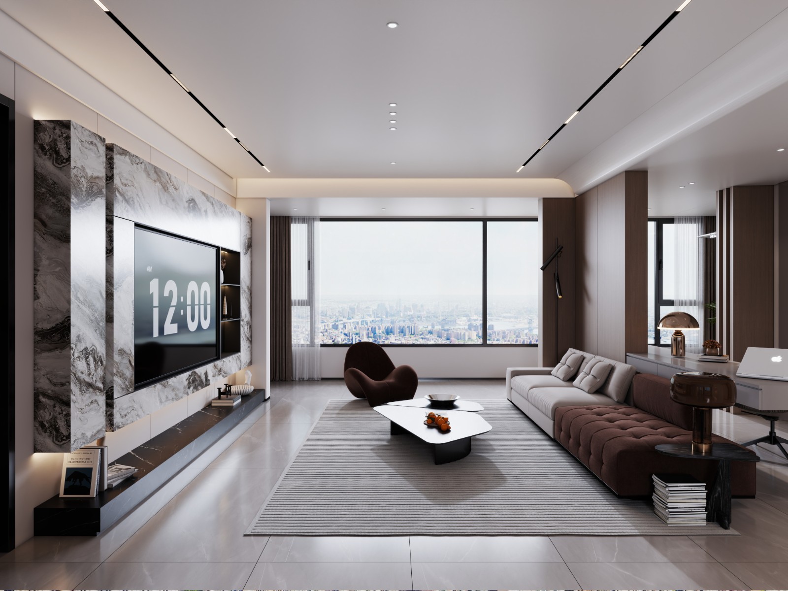 以简洁线条勾勒现代轮廓,借大窗引入城市景观,大理石背景墙与深色家具碰撞,营造开阔、时尚且具质感的社交空间。