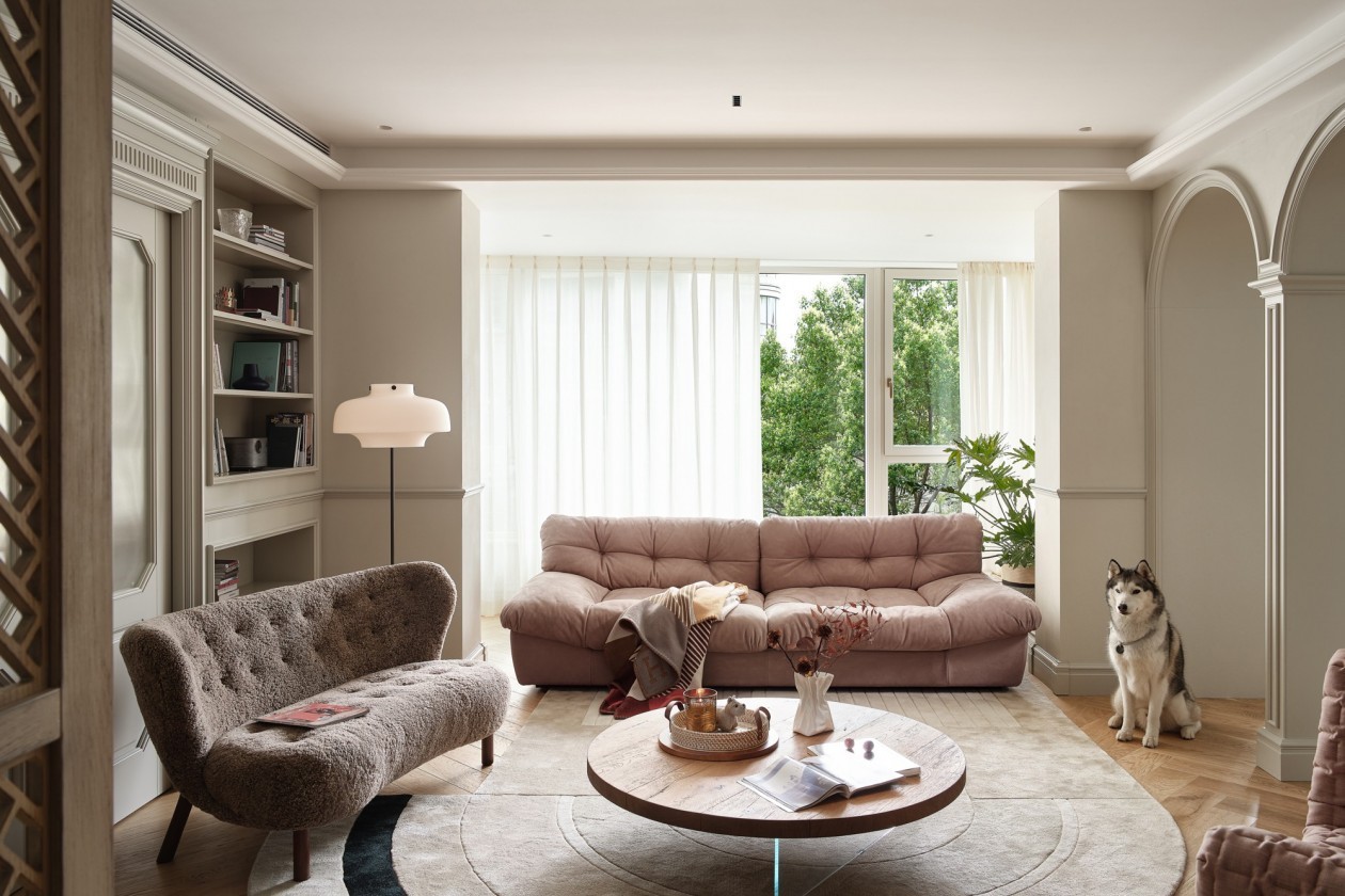 客厅中央铺着一张圆形地毯,浅米色底纹,像被阳光晒软的棉垫,踩上去陷进蓬松的暖意里,悄悄圈出一方放松的核心区。 灰沙发贴着地毯边缘摆放,布艺面料泛着细腻的肌理,靠背与扶手弧度柔和,像一片沉静的云,随意扔几个同色系抱枕,便成了最舒服的倚靠处。 旁边立着一把粉色单椅,绒布座面泛着甜而不腻的光泽,椅腿是纤细的黄铜色,与灰色沙发形成温柔的撞色。阳光漫进来时,粉椅的暖调落在灰沙发的冷感上。