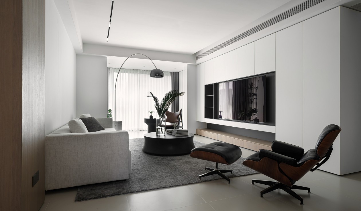 客厅以黑白灰勾勒出冷静克制的调性。整面黑色电视墙哑光质感,如墨色幕布般沉稳,下方悬空柜体藏着影音设备,线条利落不拖沓。 黑色茶几与电视墙呼应,台面嵌着细浅纹路,边角磨得圆润。白灰色沙发呈 L 形铺开,布艺面料泛着柔和光泽,与灰色地毯的短绒肌理相接,像一片被云朵托住的浅滩。 光影漫过时,黑色的沉郁与白灰的轻盈相互平衡,整个空间在极简中透着***的松弛感。