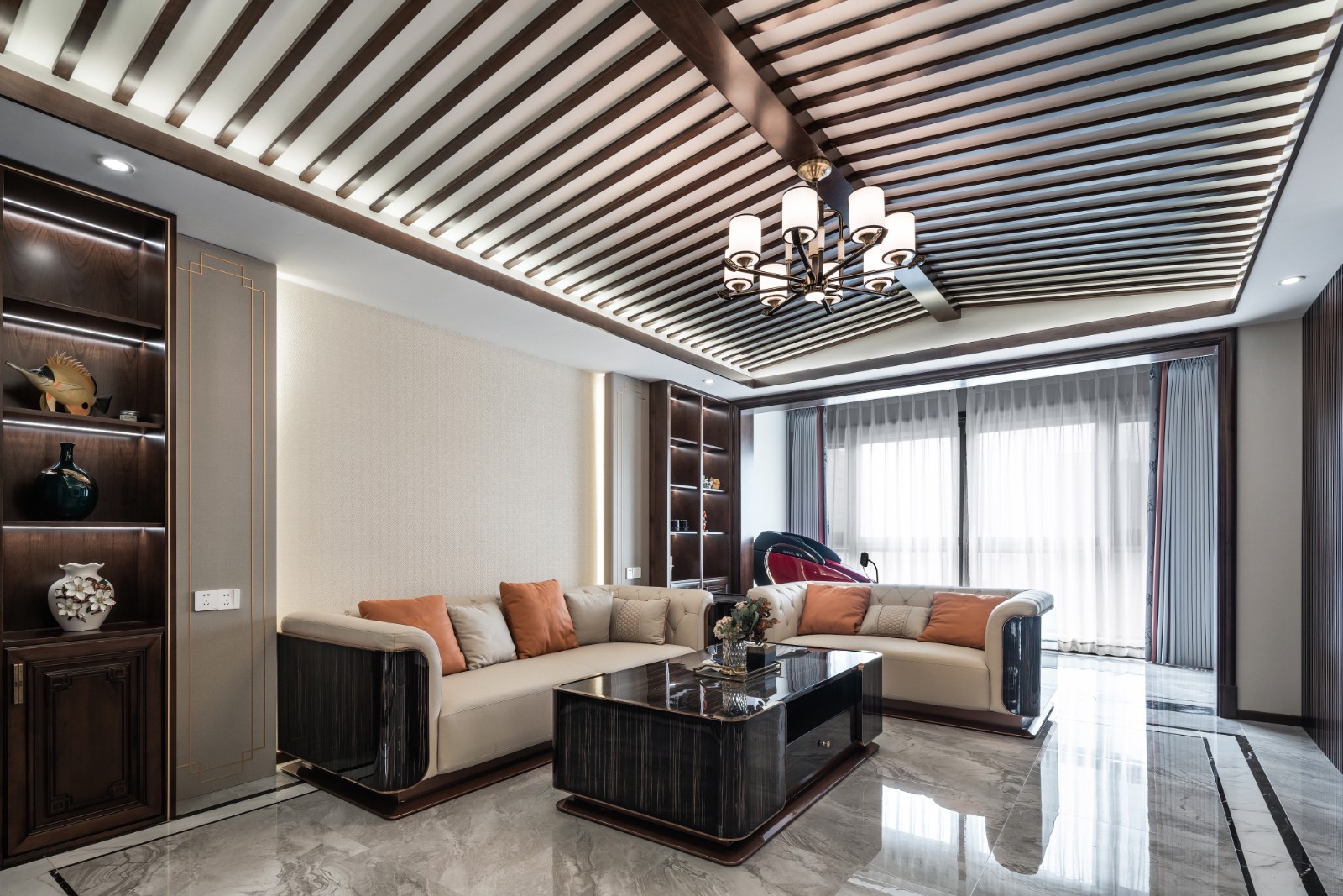 客厅左侧立着红木格栅背景墙,深棕木纹交织出疏朗格纹,光影透过格栅缝隙落在地面,如流动的中式韵律。格栅前是一面悬空大理石背景墙,浅灰石面带着自然的水墨纹路,中央镶嵌着电视,屏幕与石面齐平,不显突兀。红木的沉郁与大理石的清润相互映衬,格栅的通透消解了石材的厚重,电视嵌入其中,让传统韵味与现代功能无缝融合,整个墙面既有中式的雅致风骨,又透着利落的当代感。