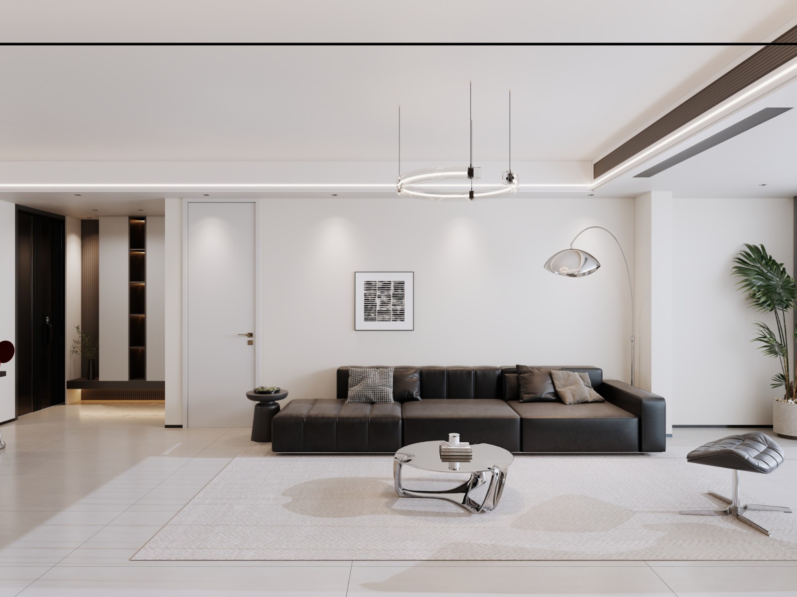以黑白灰为主调,极简线条勾勒空间,悬浮吊灯、弧形落地灯增添现代感,深色沙发与艺术挂画呼应,营造简约***的社交场域。