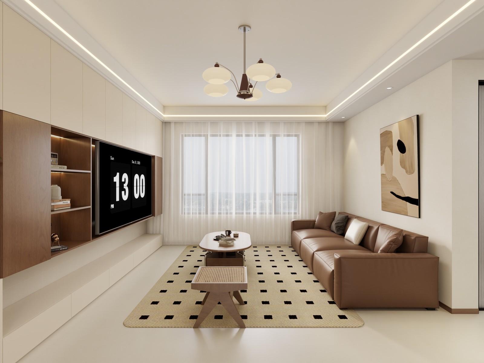 米白为主色调,悬浮柜体结合开放式收纳,搭配棕色皮沙发、几何地毯,线性灯光与吊灯营造层次,简约又具质感 。
