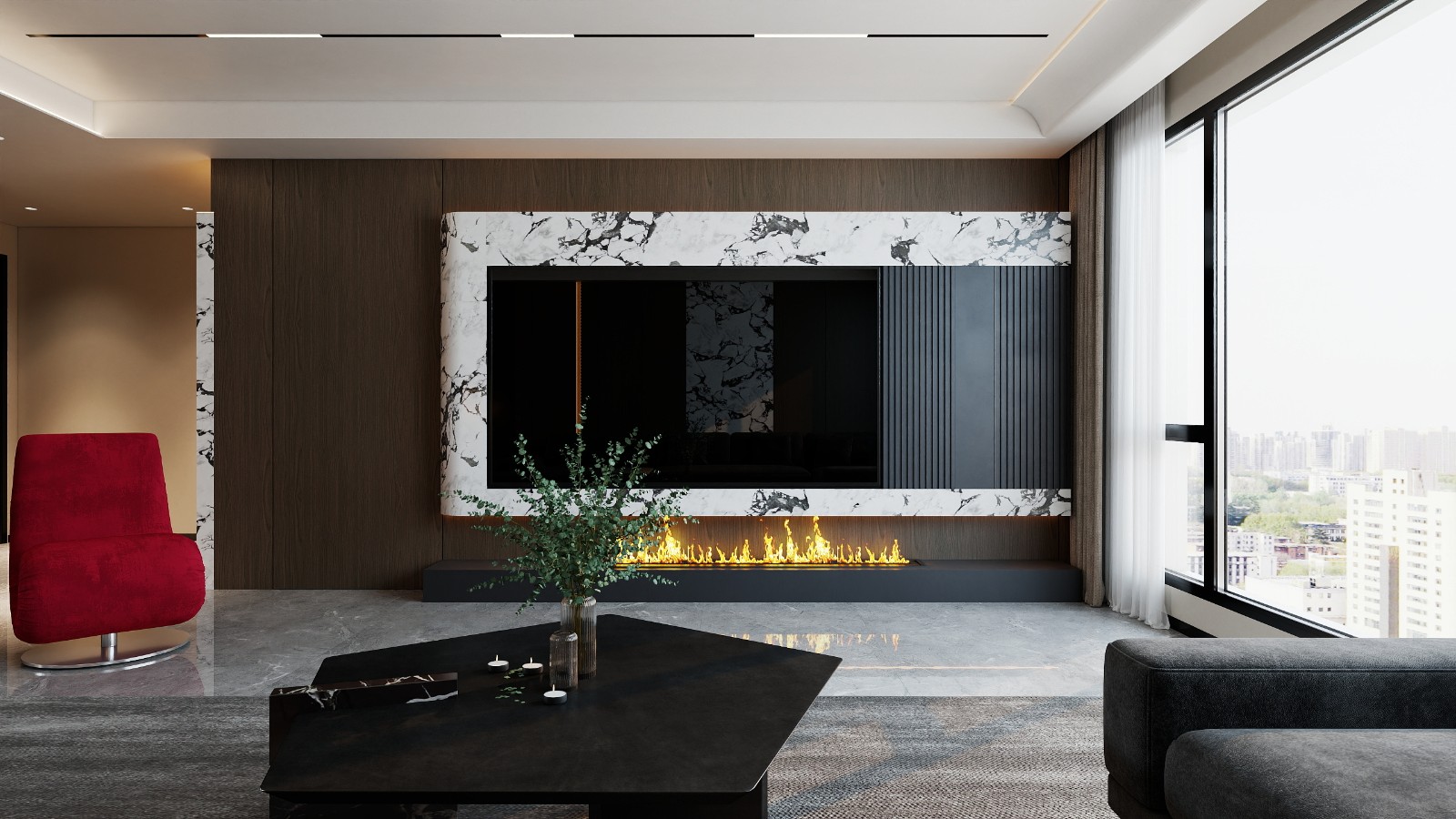 运用深色木质背景墙、大理石元素与仿真火焰装置,搭配简约沙发与亮色单椅,结合大窗引入城市景观,营造精致且具氛围感的社交空间。