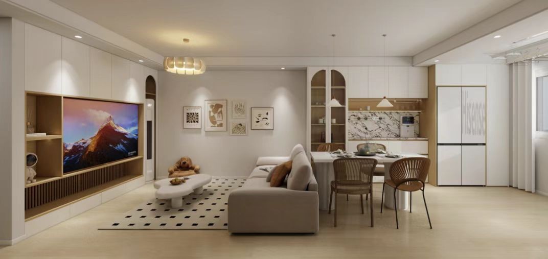 客餐厅以白色为主色调,搭配浅木色,温馨明亮。客厅有嵌入式电视柜,大屏电视播放山水画面,旁设弧形门洞。米色沙发配抱枕,前方是造型别致的白色茶几,地面铺黑白方格地毯,角落还有小熊坐凳。餐厅与客厅相连,白色餐桌配藤编椅,上方吊灯简约,餐边柜嵌入电器,墙面挂装饰画,整体空间开阔,功能分区清晰,尽显舒适雅致。
