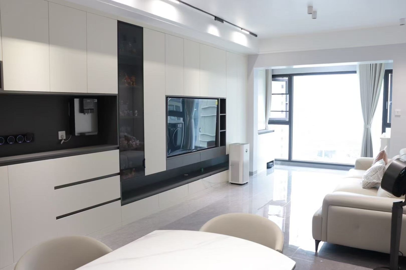 「客餐厨一体」白柜黑调勾勒简洁轮廓,玻璃展柜藏纳趣味,极简中透着生活温度