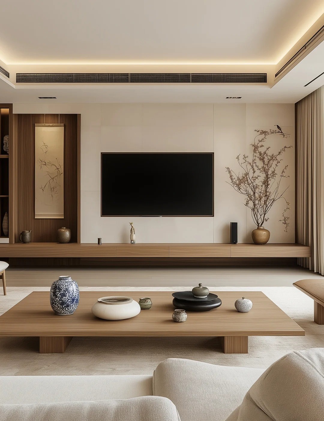 山水画屏风、博古架陈设构成"移步换景"的立体长卷