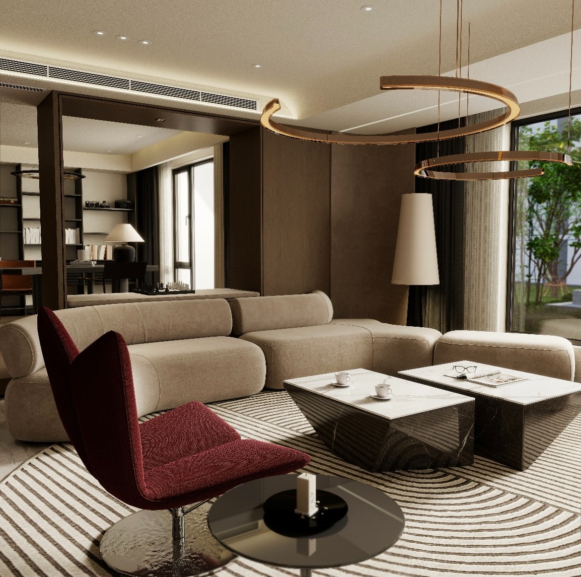 现代简约客厅,浅棕沙发、红椅,环形吊灯,通透雅致。