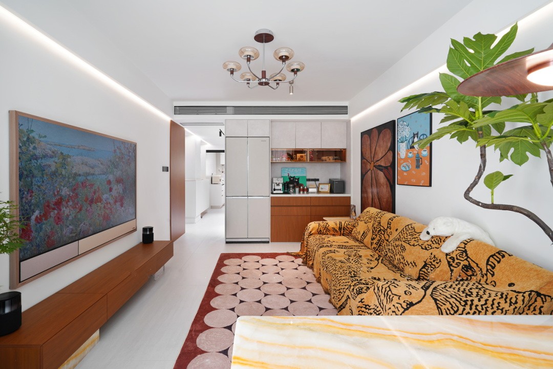 就连电视柜的设计也呼应了这两种材质,真正实现了 “一石多用”,让创意贯穿空间。