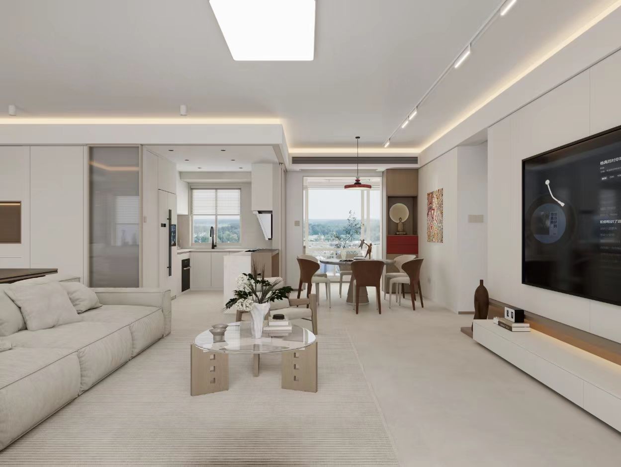 ,以浅色调为主,客厅有沙发、玻璃茶几,餐厅设圆桌餐椅,连通开放式厨房,大窗引入自然光线,空间开阔明亮,简约又温馨。