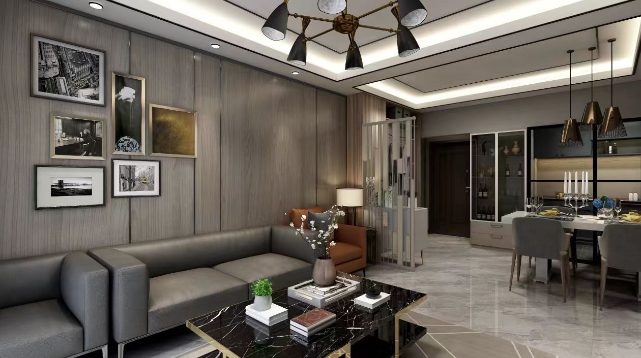客餐厅木色墙面挂艺术画,深灰沙发搭配黑金花茶几,天花板有造型灯,餐厅与客厅以隔断区分,整体简洁时尚、格调雅致。