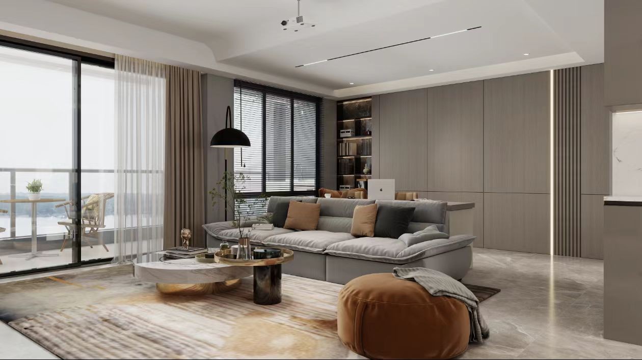 客厅,浅灰调为主,大沙发配抱枕,圆形茶几别致,落地灯、书架增添氛围。大落地窗连通阳台,可赏户外景色,整体宽敞明亮、舒适时尚。