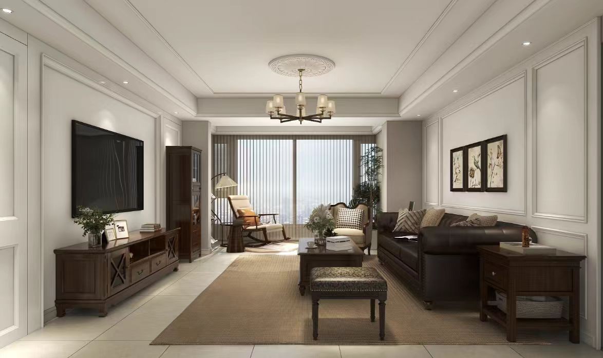 客厅,以白色墙面、深色家具为主。有皮质沙发、摇椅,搭配吊灯、装饰画,电视墙简约,大窗引入光线,空间温馨雅致,尽显舒适与格调。