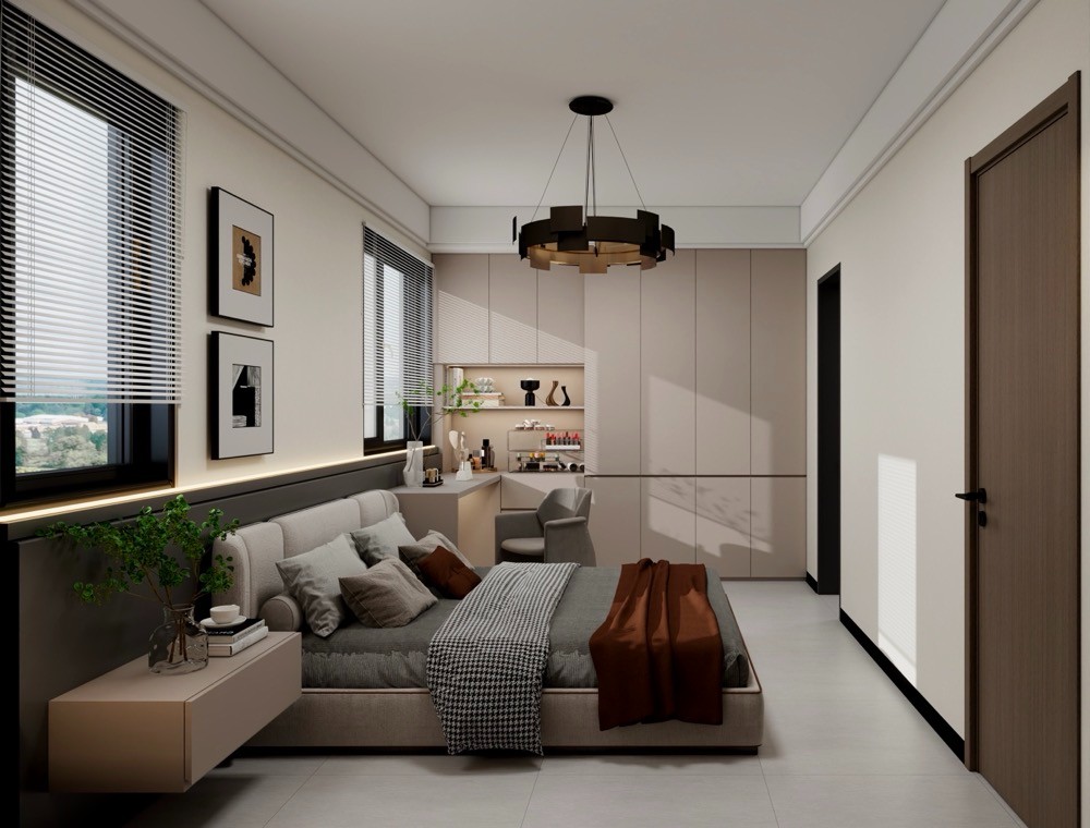这款卧室以“简约而不简单”为设计理念,通过精简的线条、纯净的色彩和高质量的材质,打造出一个既具有现代感又不失温馨氛围的休憩环境