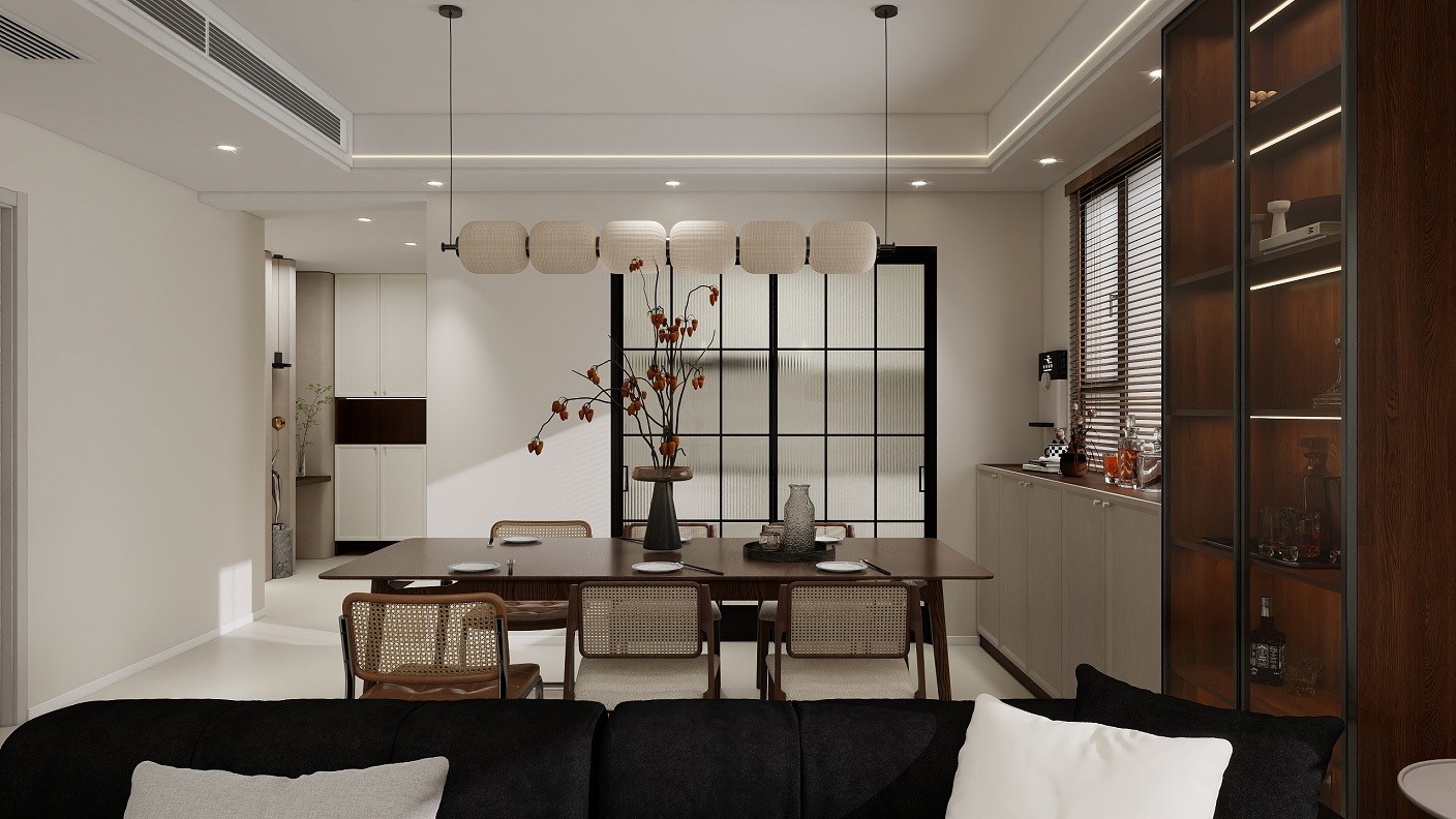 中古风在硬装上突出简约清爽,没有繁杂的设计造型,整体上都非常简洁,更多的是体现功能性。在设计时不用硬拗造型,重要的是软装方面要突出质感。