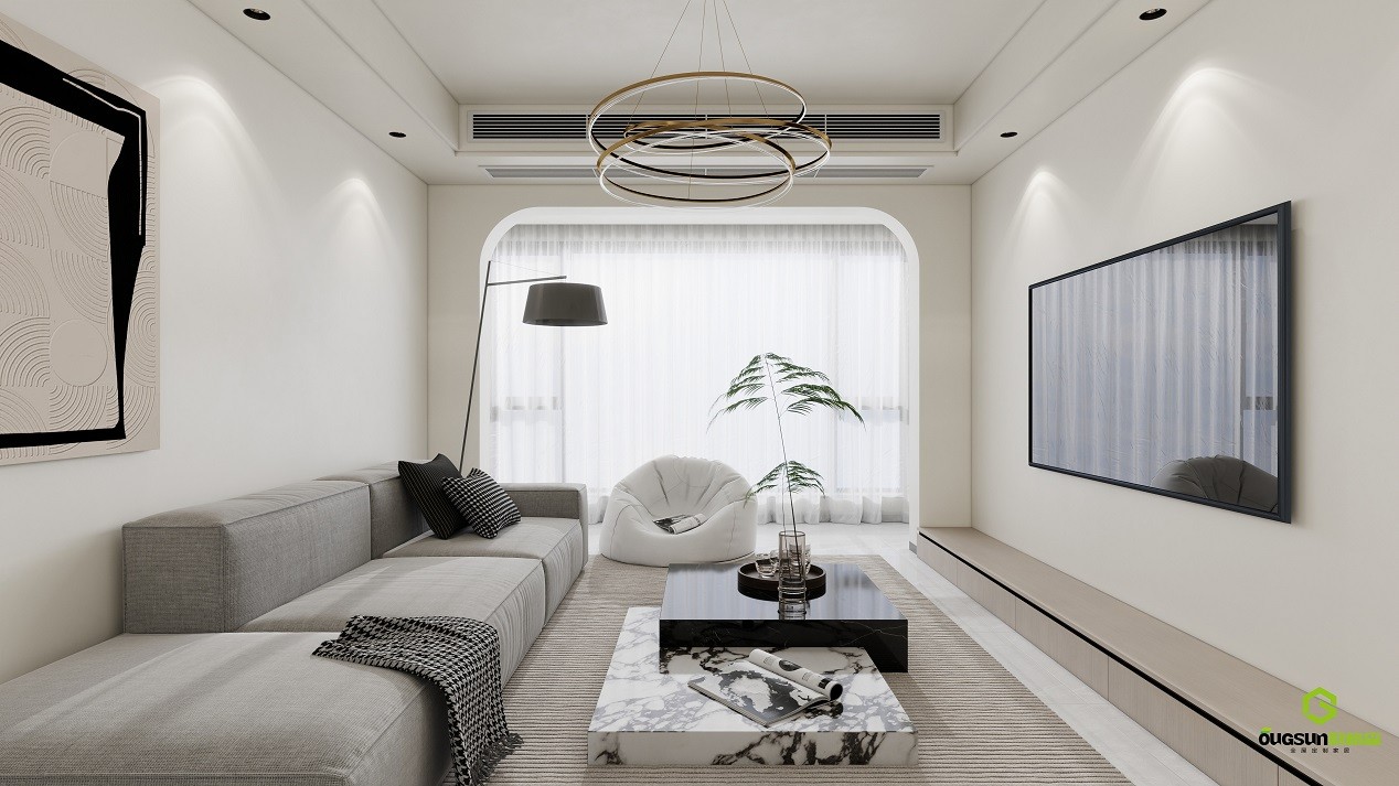 简约风+暖色调营造出一种温馨而舒适的氛围。家具的选择简洁大方,搭配柔和的灯光效果,显得空间更加宽敞明亮。