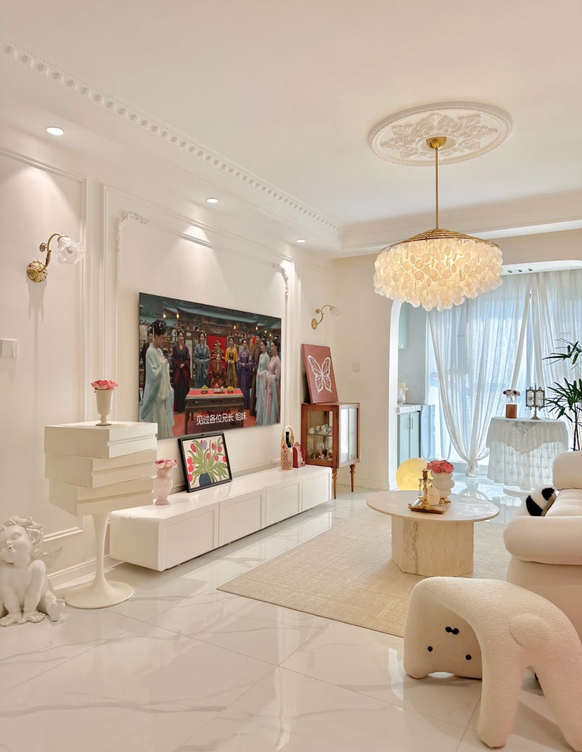 色彩搭配 整体以浅色调为主,墙面采用淡蓝色乳胶漆,营造宁静氛围。搭配清新的绿色系软装,如沙发抱枕、地毯,与白色沙发、家具相互映衬,带来自然清新之感。